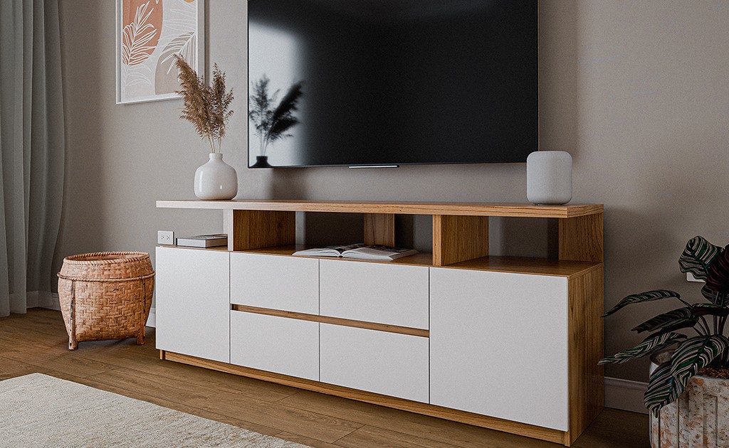 El living se siente más amplio cuando el área de TV está despejada. Elegí racks con puertas y estantes integrados, como el Modular Lucrecia o Victoria. Te permiten ocultar cables y objetos cotidianos, manteniendo una estética limpia y organizada.