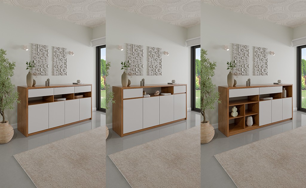 Aprovechá las paredes del comedor con un vajillero como el Tokio o Phuket. No solo son piezas de diseño que visten el ambiente, sino que ofrecen un espacio de guardado extra fundamental para liberar las alacenas de la cocina.